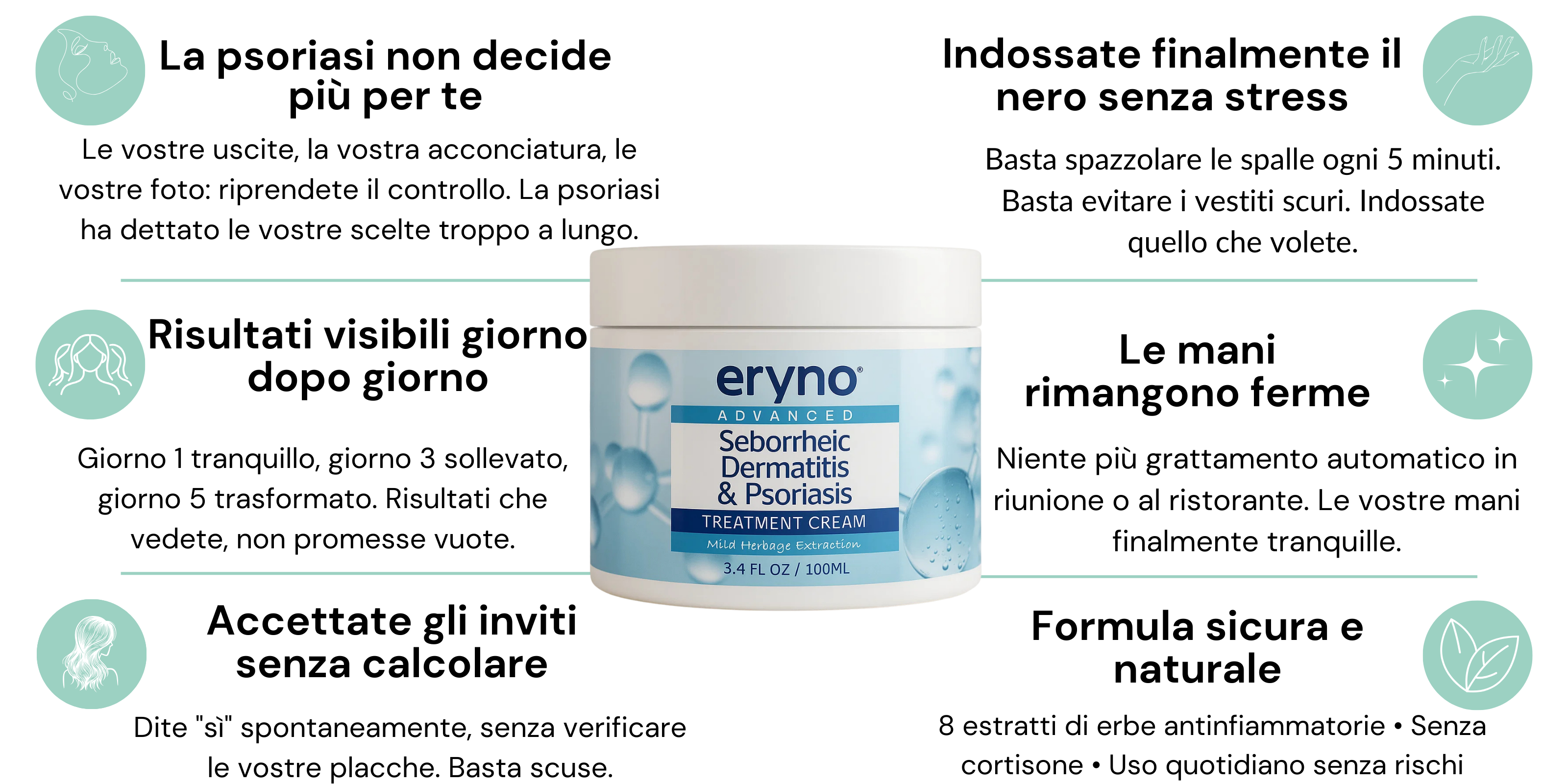 “Ho speso centinaia di euro in trattamenti contro la psoriasi. Dermatologi, creme, shampoo medicati. Niente funzionava... fino ad ora. Già dalla seconda applicazione: meno arrossamenti, cuoio capelluto lenito. Finalmente una crema che capisce la psoriasi.”